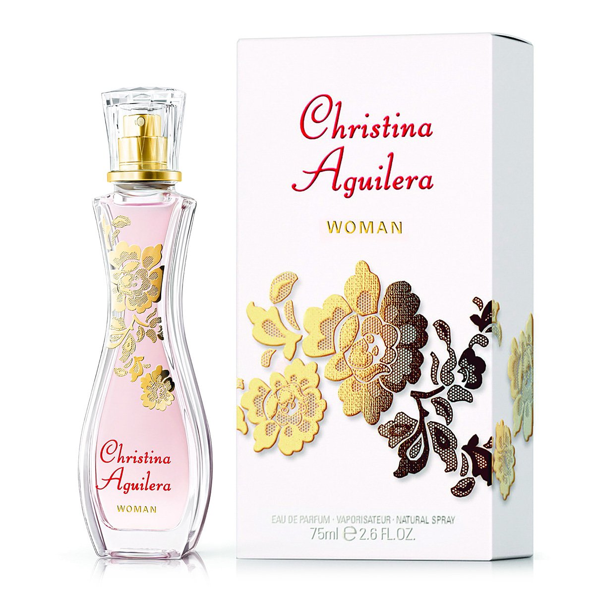 Флакон Aguilera Woman декорирован золотистым цветочным орнаментом, а прозрачное стекло открывает взгляду нежно-розовый цвет ароматной жидкости внутри.