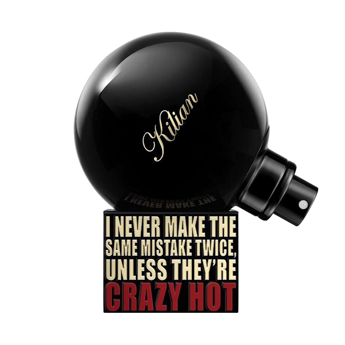 Духи Килиан Крэйзи Хот заключены в массивный флакон в форме черной сферы на квадратном пьедестале. На основании флакона размещена игривая надпись, выполненная эффектным шрифтом в красно-золотистых тонах.