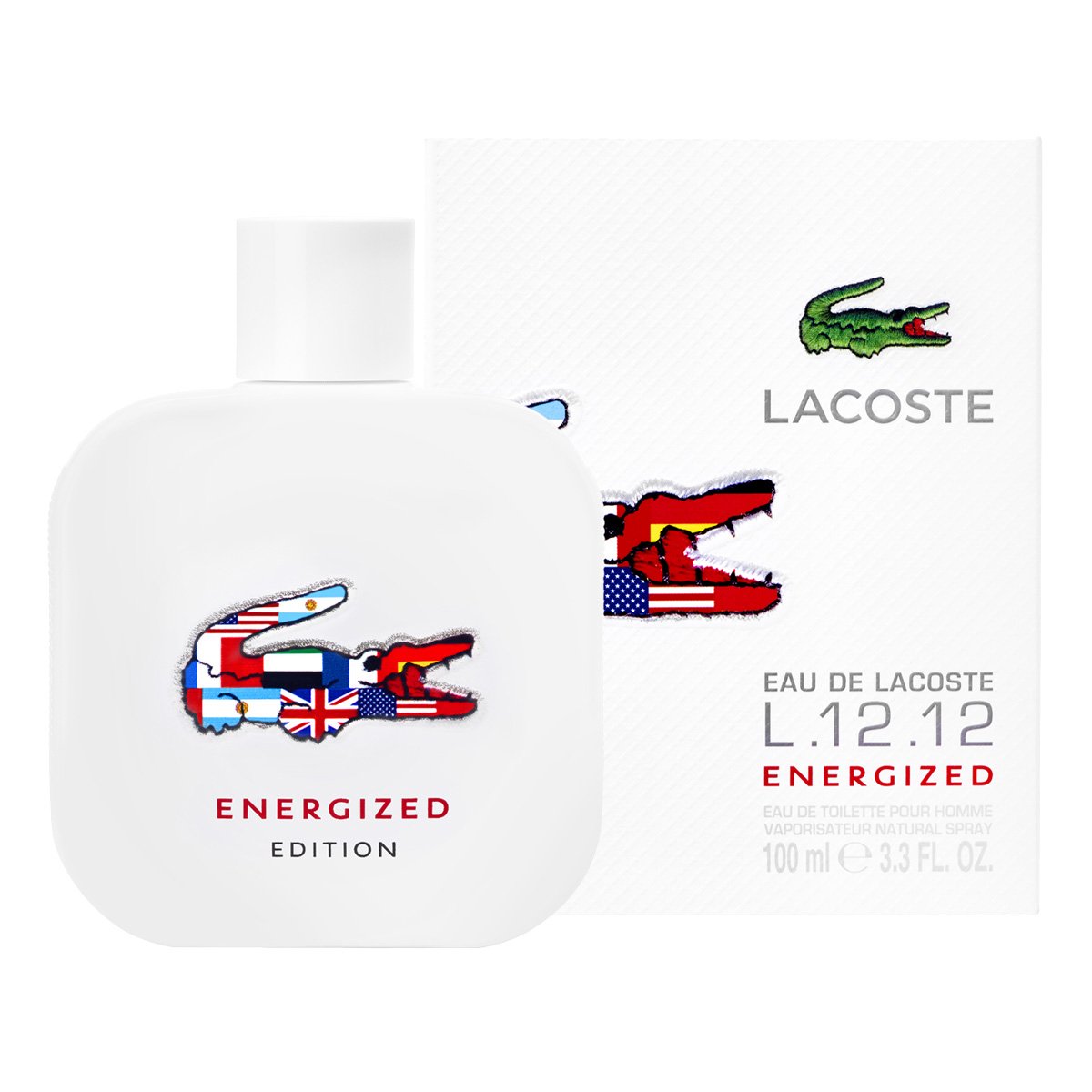 Флакон аромата Energized традиционно украшен символичным, разноцветным «крокодильчиком», в котором объединились флаги сразу нескольких стран. Парфюм посвящен миру спорту, энергии и страсти болельщиков, уверенности и силе спортсменов.