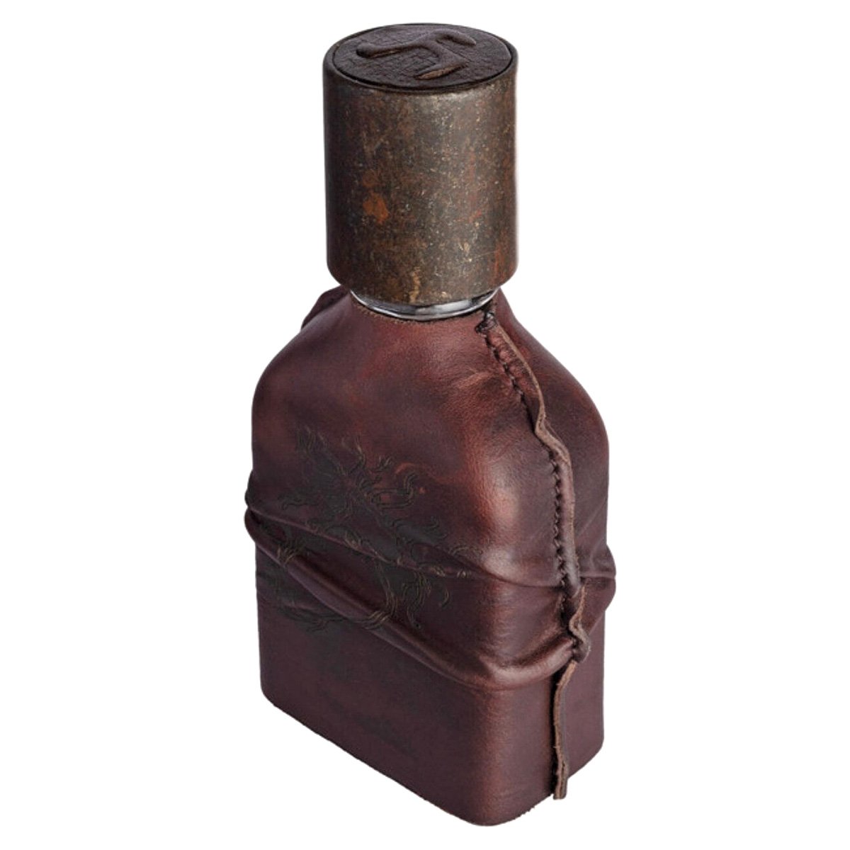Духи заключены в темно-коричневый флакон, обтянутый кожей растительного дубления, увенчанный металлическим колпачком «под ржавчину» с тисненым на коже логотипом.